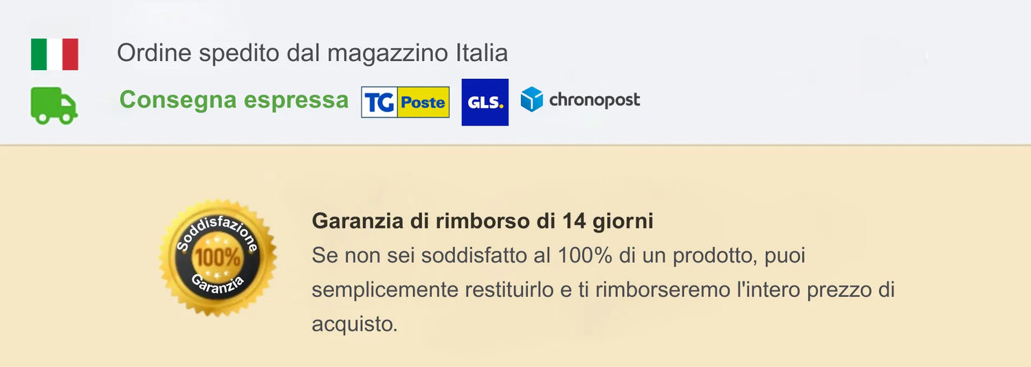 • Senza rischi: garanzia di rimborso di 30 giorni (se non sei soddisfatta, rimborsiamo il valore del prodotto)